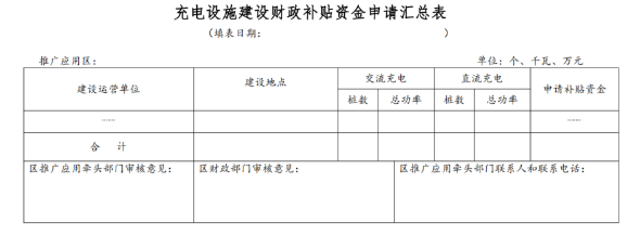 充电设施建设运营单位向项目所在区申报财政补贴资金。区充电设施建设工作牵头部门、区财政审核汇总后,将《充电设施建设财政补贴资金汇总表》(附表1)报送至市工业和信息化局、市交通运输局、市财政局审核。