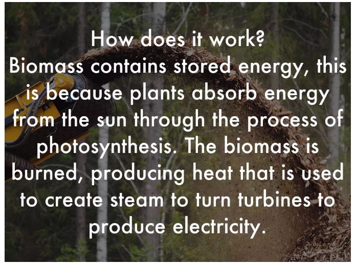 生物质能包含来自太阳的储存能量。如前所述,植物通过光合作用吸收太阳的能量。当生物质被燃烧时,生物质中的能量以热的形式释放出来。