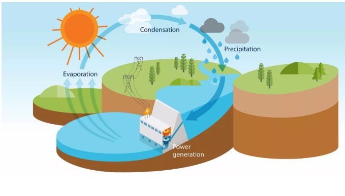 当太阳加热海洋中的水时,表面的一些水就蒸发了。水蒸气上升,当它到达更高层的空气并冷却时,水以雨、冰雹或雪的形式下降。水流成溪流和河流,最后到达大海,在那里再次蒸发。所以说,水力发电的能量是来自太阳热能和地球引力。