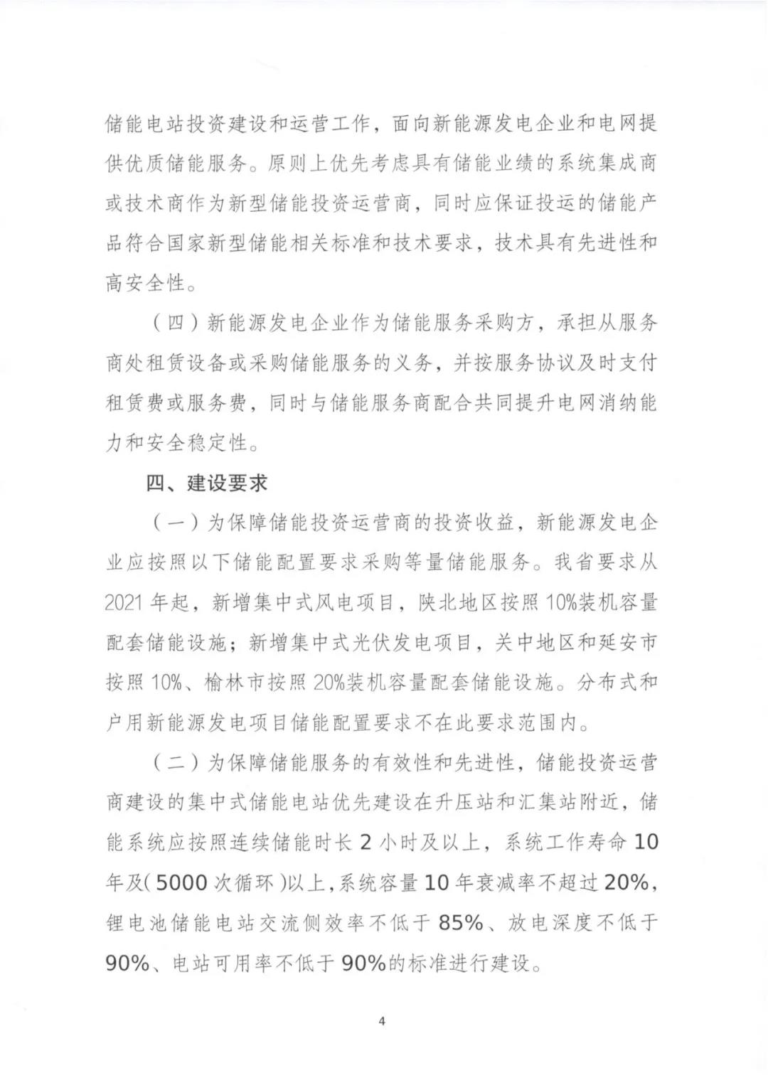 文件要求,从2021年起,新增集中式风电项目,陕北地区按照10%装机容量配套储能设施;新增集中式光伏发电项目,关中地区和延安市按照10%、榆林市按照20%装机容量配套储能设施。分布式和户用新能源发电项目储能配置要求不在此要求范围内。