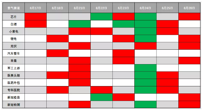 红色代表大涨、绿色代表大跌,从下图简单的数据统计中可以看出近期这些高景气板块在持续轮动: