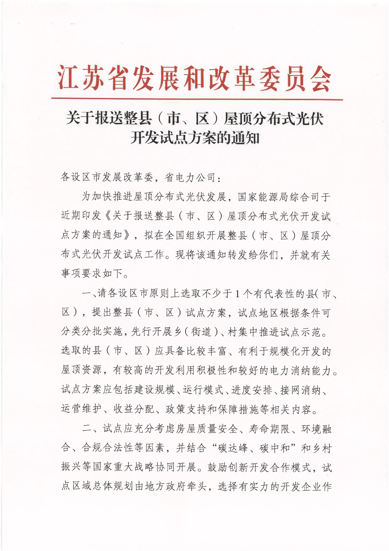 今日,江苏省能源局也正式下发了《关于报送整县(市、区)屋顶分布式光伏开发试点方案的通知》。