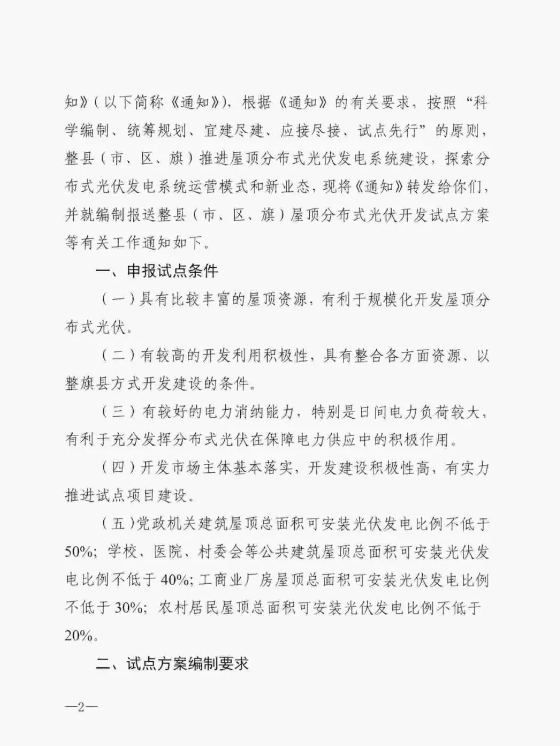 其中,申报试点要求党政机关建筑屋顶总面积可安装光伏发电比例不低于50%;学校、医院、村委会等公共建筑屋顶总面积可安装光伏发电比例不低于40%;工商业厂房屋顶总面积可安装光伏发电比例不低于30%;农村居民屋顶总面积可安装光伏发电比例不低于20%。并要求于7月7日下午5∶00前,将整县、旗(市、区)屋顶分布式光伏开发试点方案送审稿报送内蒙古自治区能源局,逾期不再受理。
