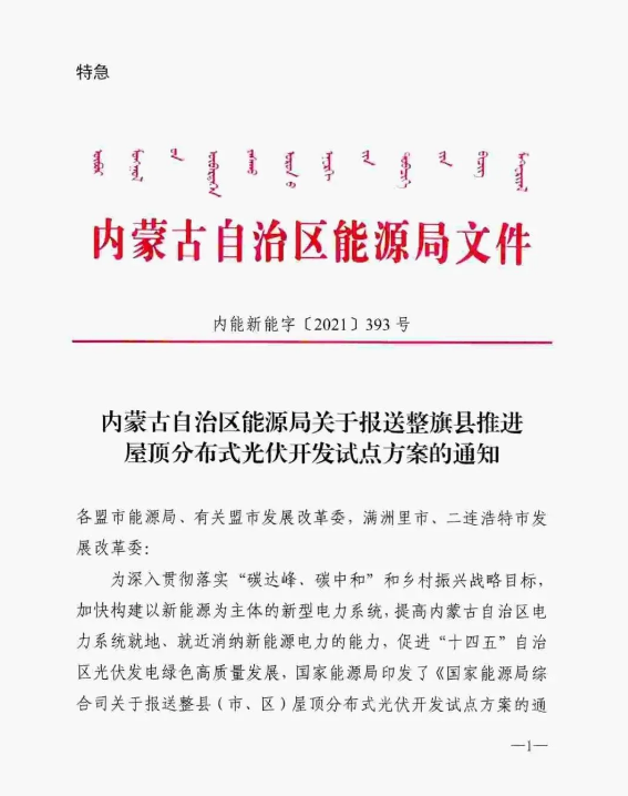 7月7日前报送!内蒙古自治区发布整旗县推进屋顶分布式光伏开发试点方案