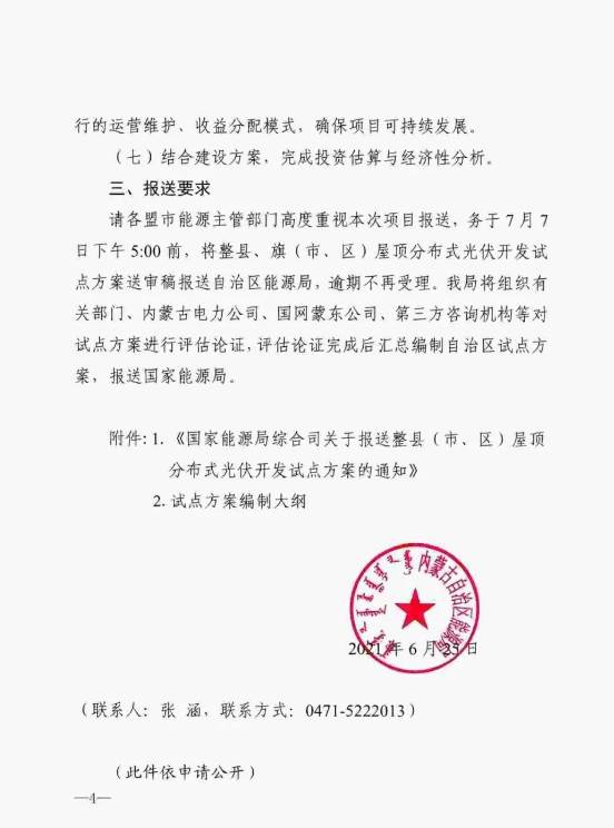 6月25日,内蒙古自治区能源局印发《关于报送整旗县推进屋顶分布式光伏开发试点方案》的通知。根据《通知》要求,按照“科学编制、统筹规划、宜建尽建、应接尽接、试点先行”的原则,整县(市、区、旗)推进屋顶分布式光伏发电系统建设,探索分布式光伏发电系统运营模式和新业态。