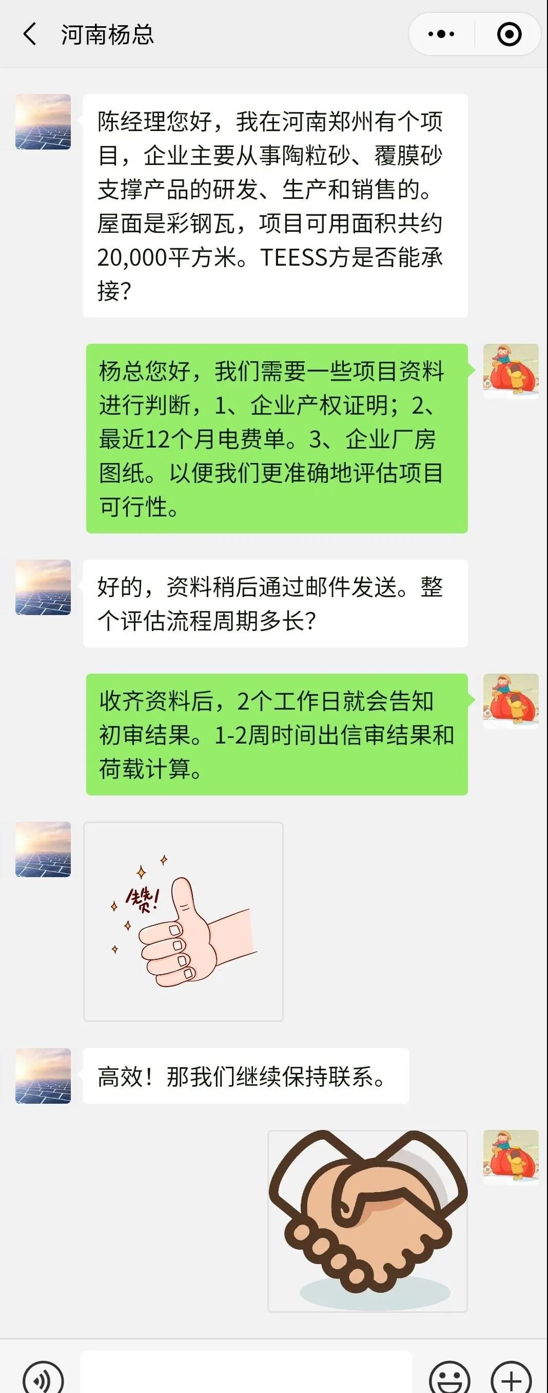 杨总与厂区业主建立联系,针对厂区情况、屋顶结构、用电水平等基本问题进行访谈,确定合作意愿和用能需求。