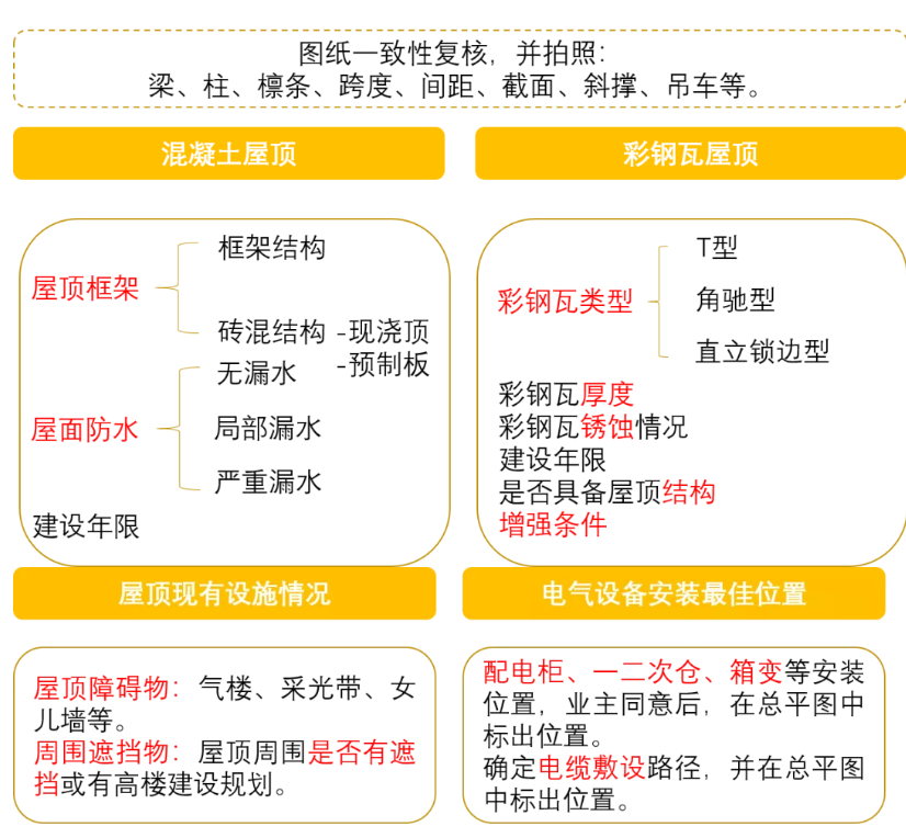 考察屋面结构(混凝土、彩钢瓦)、屋顶使用年限和面积(至少2万平米以上)。