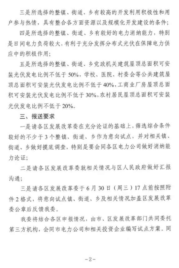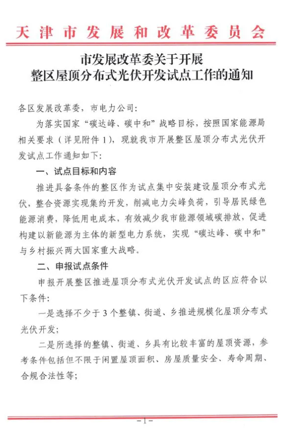 日前,天津市发改委发布关于开展整区屋顶分布式光伏开发试点工作的通知。通知明确,申报开展整区推进屋顶分布式光伏开发试点的区要选择不少于3个整镇、街道、乡推进规模化屋顶分布式光伏开发;所选择的整镇、街道、乡具有比较丰富的屋顶资源,参考条件包括但不限于闲置屋顶面积、房屋质量安全、寿命周期、合规合法性等。