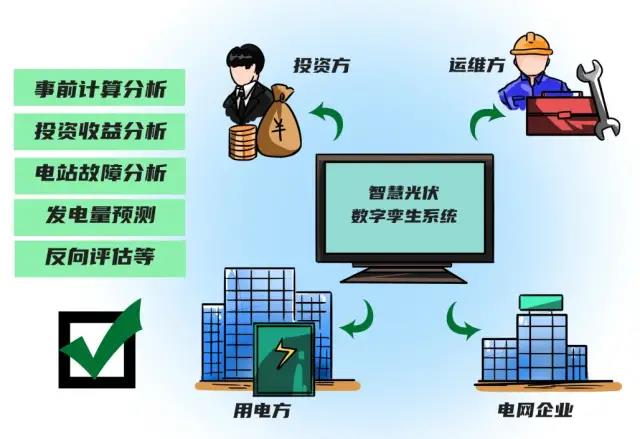 智慧监测平台为投资方、运维方、用电方、电网企业四方主体进行服务,提供事前计算分析、投资收益分析,电站故障分析、发电量预测以及反向评估等多元化功能,使得服务商管理更方便,成本更压缩。