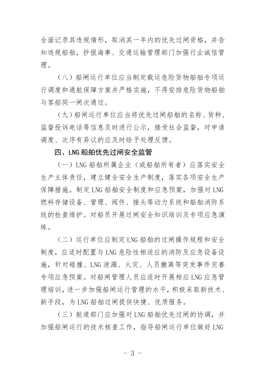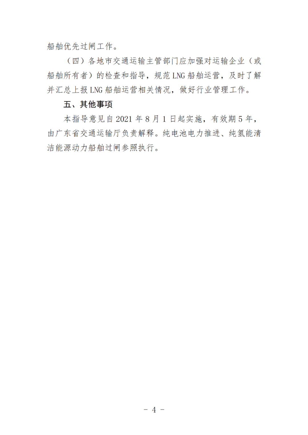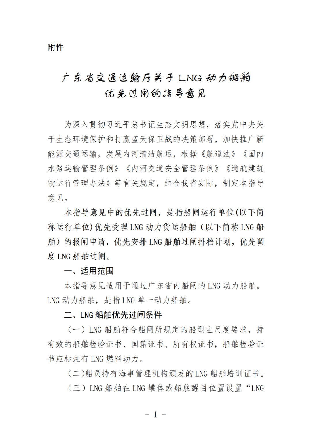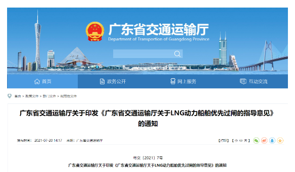 7月20日,广东省交通运输厅印发《广东省交通运输厅关于LNG动力船舶优先过闸的指导意见》。该意见中优先过闸是指船闸运行单位(以下简称运行单位)优先受理LNG动力货运船舶(以下简称LNG船舶)的报闸申请,优先安排LNG船舶过闸排档计划,优先调度LNG船舶过闸。自2021年8月1日起实施,有效期5年,由广东省交通运输厅负责解释。