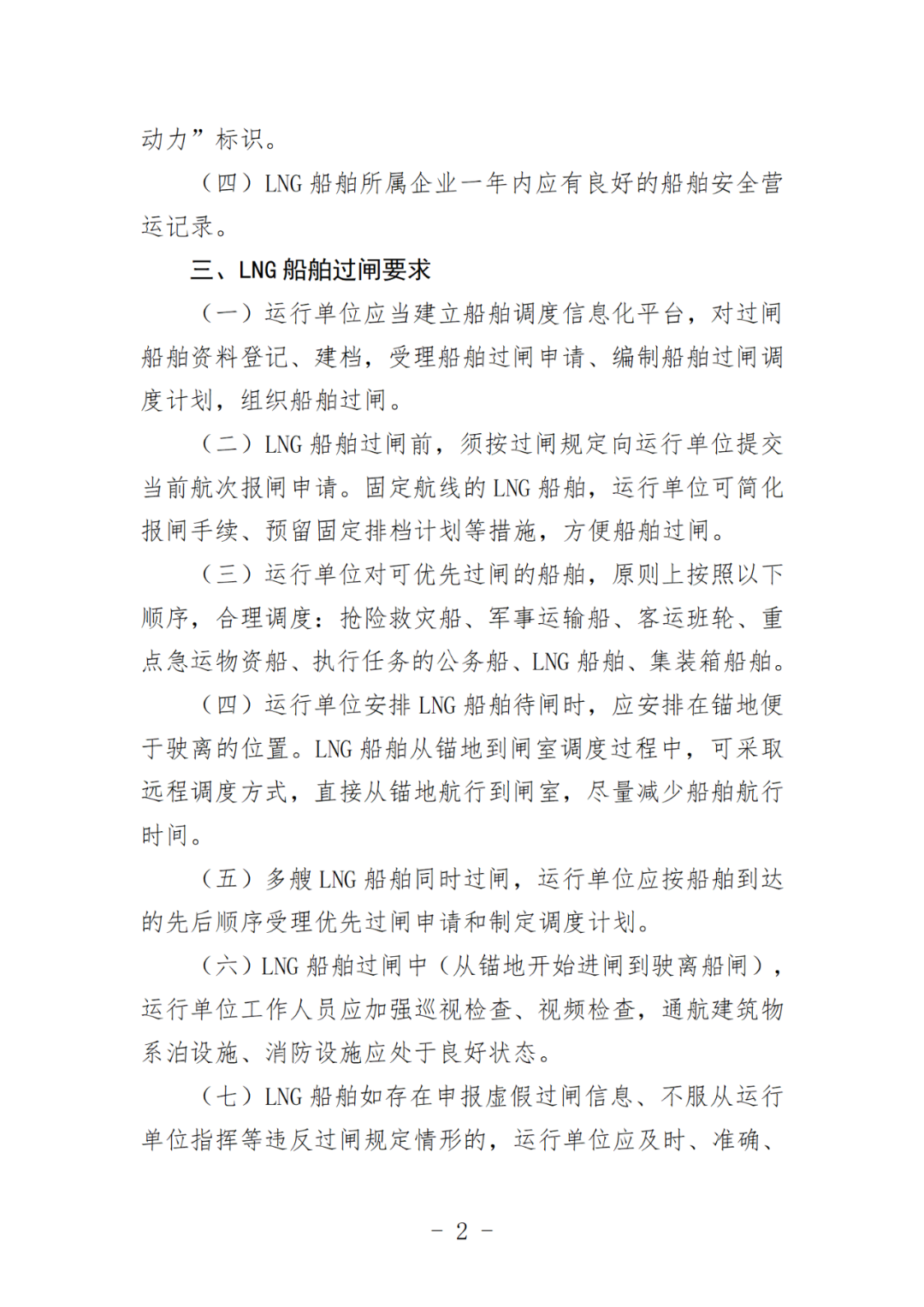 (一)LNG船舶符合船闸所规定的船型主尺度要求,持有效的船舶检验证书、国籍证书、所有权证书,船舶检验证书应标注有LNG燃料动力。