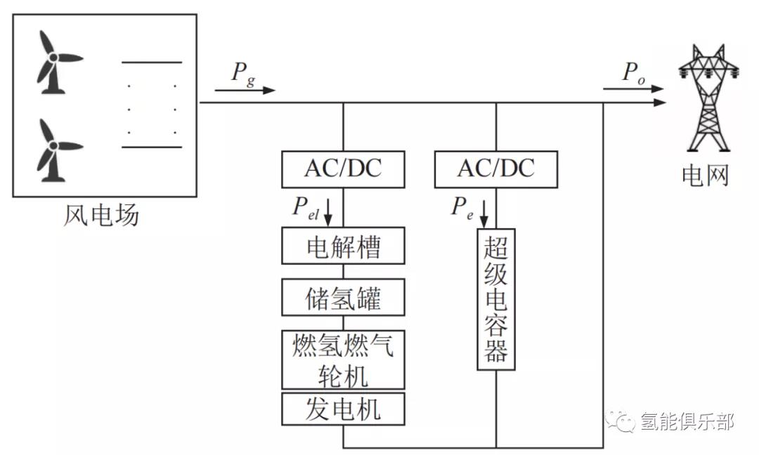 该系统的思想即是把风电场发出的质量较差的电接入电解槽电解制氢,通过氢储能技术储存电力,在电网需要时再由氢燃气轮机发电并网,可以实现对电网的削峰填谷以及对新能源的消纳,可以作为一种新型储能发电形式与风力、光伏等可再生能源配合发电。