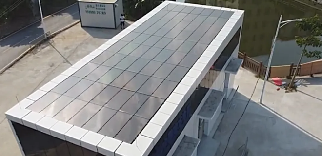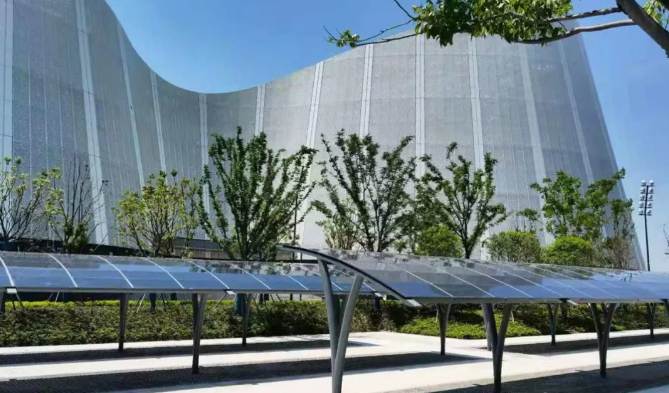 本次国家电投集团能源科技工程有限公司大门采用瑞科蓝色BIPV产品,代替传统大理石材,将光伏发电与建筑相结合,塑造新颖、美观外型的同时兼顾能源供给,是一种集发电、安全、装饰功能于一体的新型建筑幕墙。宣传栏背面采用光储一体化,为宣传栏、路灯提供源源不断的清洁能源。项目同时应用光伏+装饰幕墙、光伏+广告灯箱两种模式,引领光伏建筑一体化新方向。
