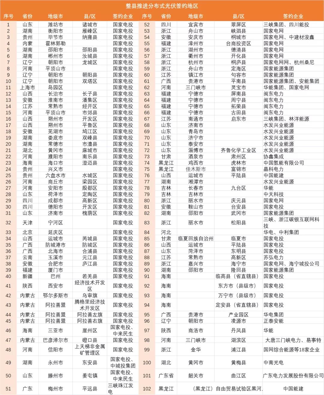 从目前统计的签约情况可以发现,已经有102个县市区与企业签约或者启动整县推进工作。其中仍以央国企为主,但也不乏深入参与其中的民营光伏企业。随着分布式光伏整县推进的落地,这或将成为中国分布式光伏市场一个划时代的起点。
