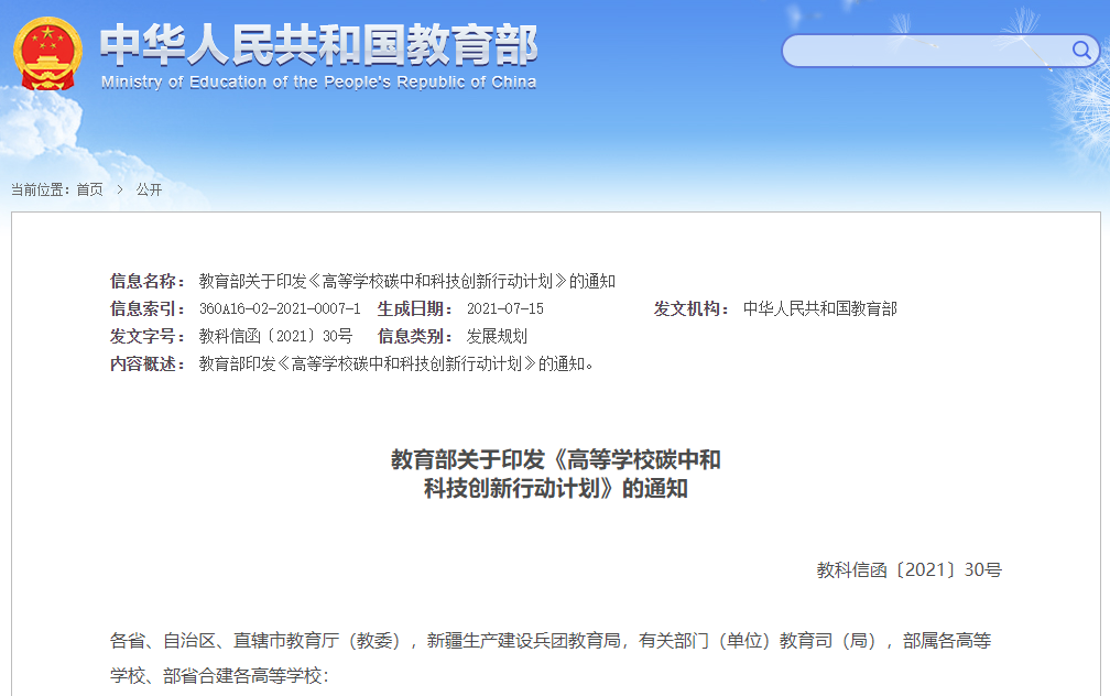 我国力争2030年前实现碳达峰、2060年前实现碳中和,是党中央经过深思熟虑作出的重大战略决策,事关中华民族永续发展和构建人类命运共同体。为贯彻党中央、国务院重大战略部署,引导高校把发展科技第一生产力、培养人才第一资源、增强创新第一动力更好地结合起来,为做好碳达峰、碳中和工作提供科技支撑和人才保障,制定本行动计划。