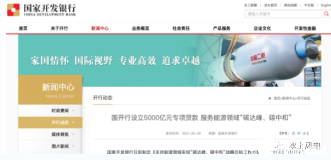 近期,国家开发银行制定《支持能源领域实现“碳达峰、碳中和”战略目标工作方案》,“十四五”期间设立总规模为5000亿元(等值人民币,含外汇)的能源领域“碳达峰、碳中和”专项贷款,其中2021年安排发放1000亿元,助力构建清洁低碳安全高效的能源体系。