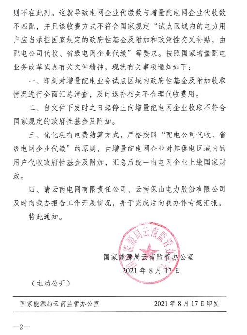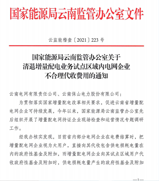 日前,云南能监办发布关于清退增量配电业务试点区域内电网企业不合理代收费用的通知。通知要点如下: