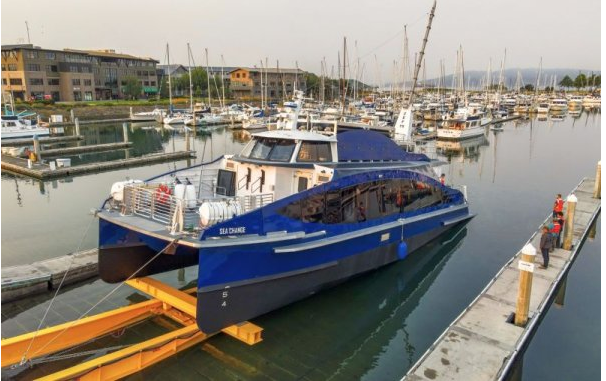由华盛顿州贝灵汉建造。美国船舶制造公司All American Marine,Inc.(AAM),SWITCH Maritime的70英尺“Sea Change”号将作为美国第一艘氢燃料电池船在加州海湾地区运营,开发该船是为了展示零排放氢燃料电池海上技术的商业化途径。尽管美国海岸警卫队仍在为海上船只使用氢燃料系统而努力,但完工的渡轮将为商业和监管机构展示了这种零碳船舶推进技术的可行性。