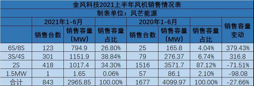 金风科技虽然没有具体细分陆上风电和海上风电销售情况。但是从其此前公开的机组型号及目前市场行情来看,金风科技上半年业绩中的6S/8S平台风机默认为海上风机、3S/4S平台风机默认为陆上风机。从机组销售情况细表中可以看到,金风科技在海上风电的机组销售容量也有近4倍大幅度提升,比明阳智能、电气风电的海上风电增幅都大。