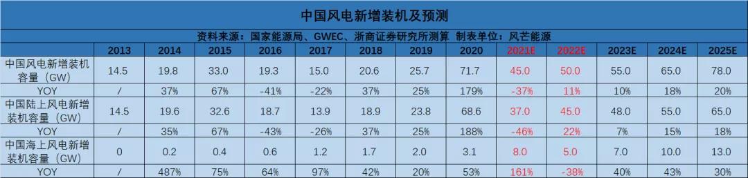 以浙商证券为例,其预测,“十四五”期间,中国平均每年风电新增装机容量预期为58.6GW,其中海上风电项目8.6GW。