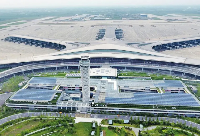 在节能减排方面,胶东机场建立独立能源中心,综合用能效率可达90%以上。其中,光伏发电项目投资3028万元,应用于房建的屋面区域,可满足航站楼20%供电需求,体现了资源节约、低碳运行、环境友好的绿色理念。
