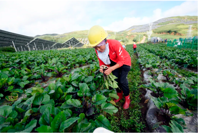 2021年8月12日早上,村民在威宁仙水窝农光互补项目红油菜苔试验基地采收红油菜苔。