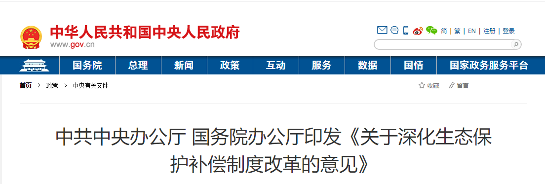 近日,中共中央办公厅、国务院办公厅印发了《关于深化生态保护补偿制度改革的意见》,并发出通知,要求各地区各部门结合实际认真贯彻落实。