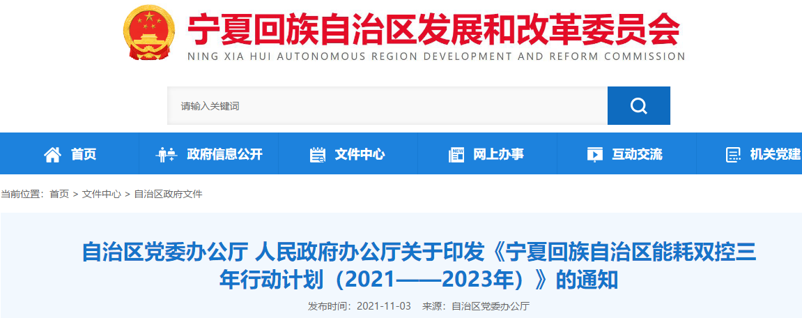 宁夏回族自治区党委办公厅、人民政府办公厅发布关于印发《宁夏回族自治区能耗双控三年行动计划(2021—2023年)》的通知。