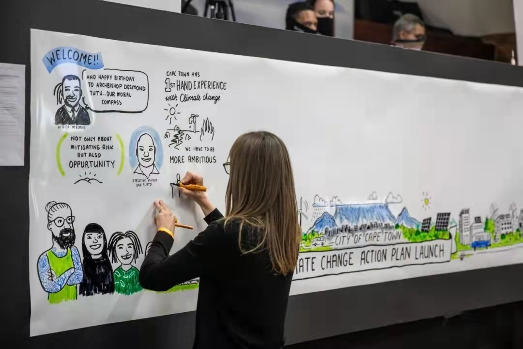 10月7日,在开普敦“气候变化行动计划”发布活动上,一位女士现场创作关于应对气候变化的漫画。
