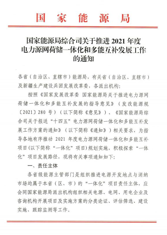 11月10日,国家能源局综合司下发《关于推进2021年度电力源网荷储一体化和多能互补发展工作的通知》。