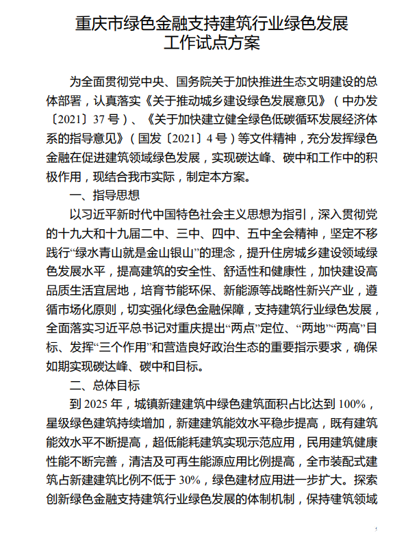 11月12日,重庆市住房和城乡建设委员会等三部门发布关于印发《重庆市绿色金融支持建筑行业绿色发展工作试点方案》的通知。