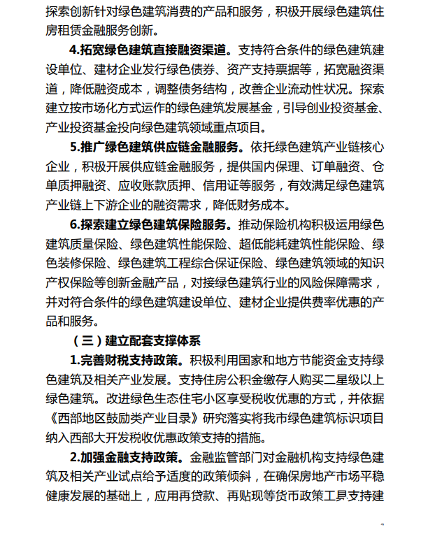 值得注意的是,通知还要求,支持住房公积金缴存人购买二星级以上绿色建筑。改进绿色生态住宅小区享受税收优惠的方式,并依据《西部地区鼓励类产业目录》研究落实将我市绿色建筑标识项目纳入西部大开发税收优惠政策支持的措施。