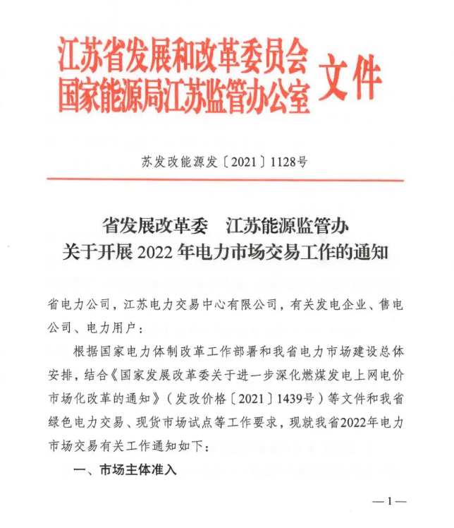江苏2022年:光伏、风电按照不超过900小时、1800小时参与交易