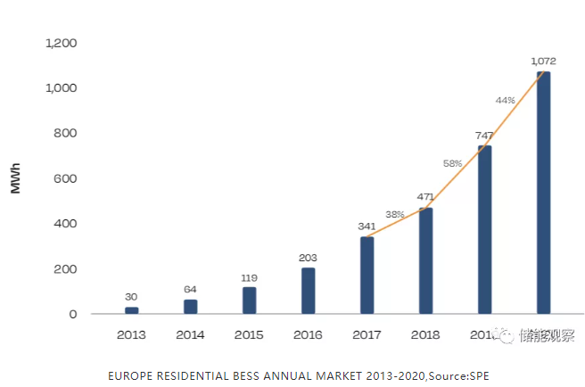 从报告披露的数据看,欧洲地区的户用电池储能增长趋势不言自明。报告显示,2020年欧洲安装了约14万套家用电池系统,仅一年装机容量就达到了1072兆瓦时,同比增长44%。