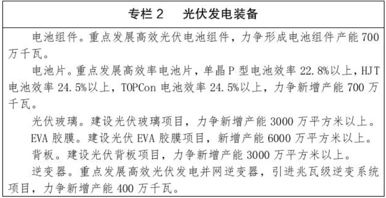 (二)光伏发电装备。依托光伏材料产业优势,鼓励多晶硅、单晶硅企业延伸产业链条,发展下游电池片、电池组件。积极引进光伏玻璃、背板、EVA胶膜、逆变器等项目,打造光伏制造全产业链,填补光伏装备及配套产业空白,力争形成与新增新能源装机规模相匹配的光伏装备制造生产能力。