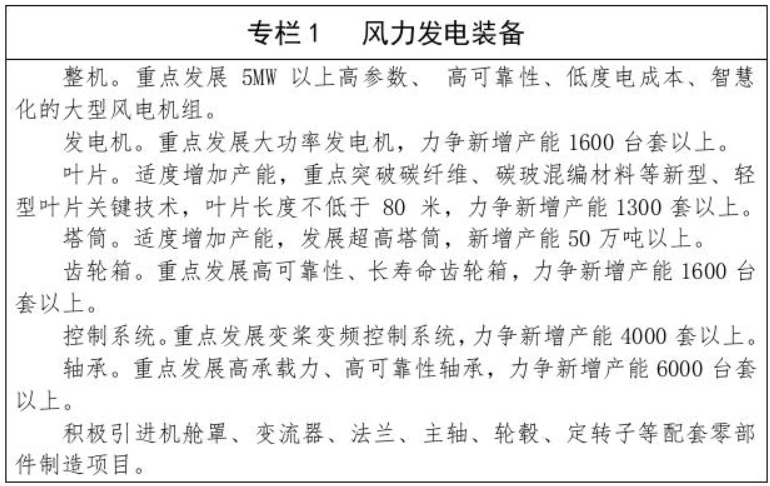 (一)风力发电装备。加快现有产能升级改造,优化产品结构,提升整机产能利用率。适度发展风电整机制造,重点发展叶片、发电机、增速机、轮毂、主轴、定转子、法兰、轴承、控制系统等核心配套零部件,提高零部件区内配套能力,着力打造风电装备制造全产业链基地,基本形成与自治区新增新能源装机规模相匹配的风电装备生产能力,努力建设我国北方重要的风力发电装备制造基地。