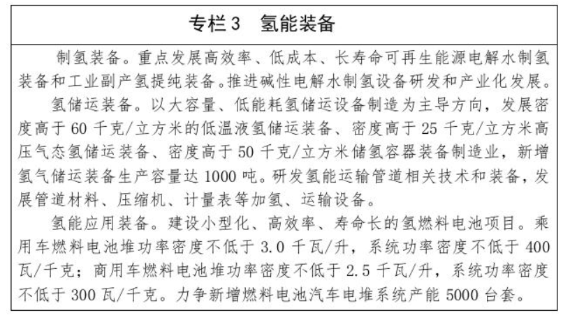 (三)氢能装备。抢抓氢能产业进入市场化临界点战略性机遇,依托丰富的能源资源和氢能应用场景,强化氢能装备技术创新,重点发展电解水制氢装备、工业副产氢提纯装备、氢能储运装备、氢燃料电池等装备制造业,实现氢能装备制造新突破。