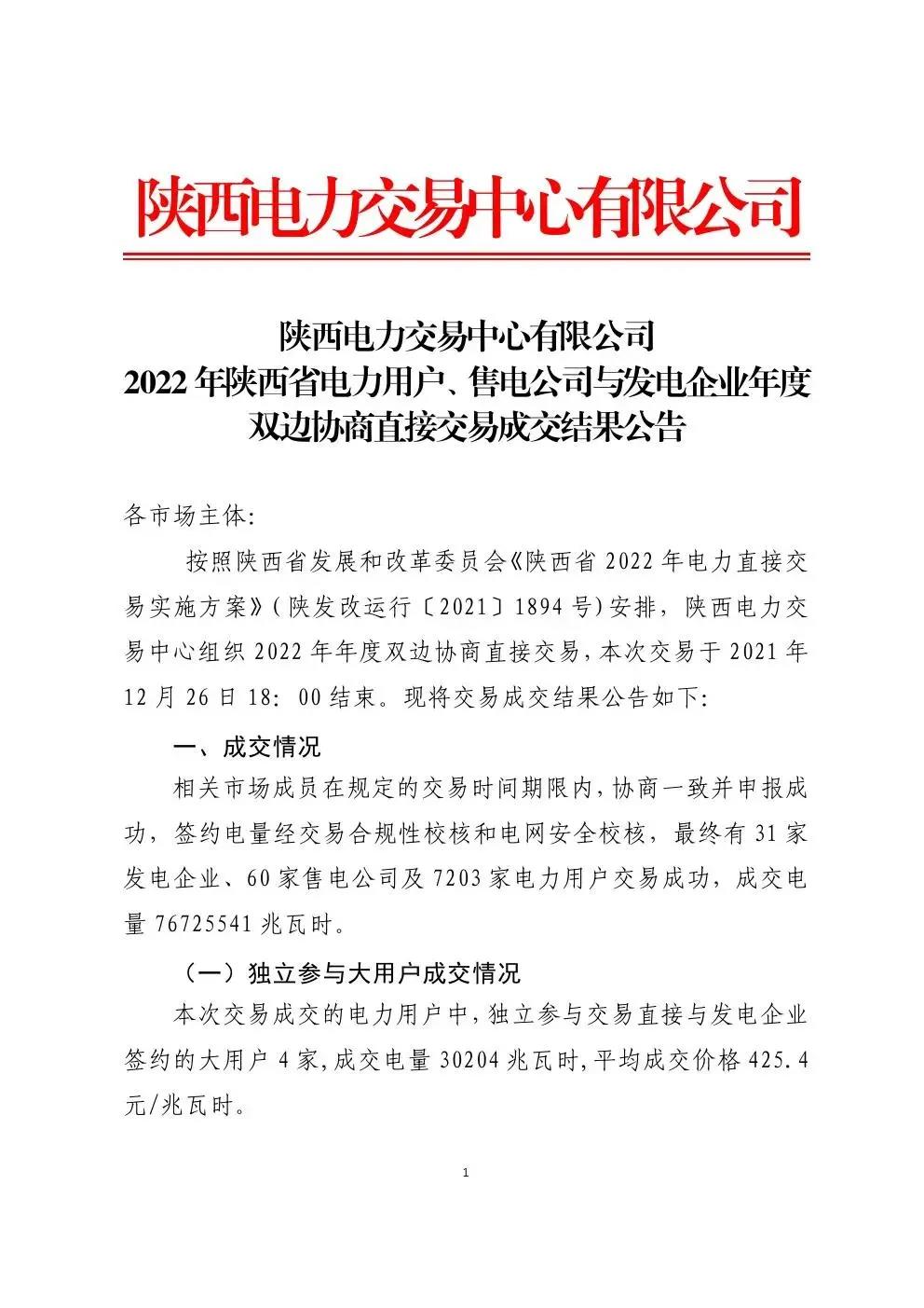陕西电力交易中心今日公布2022年陕西省电力用户、售电公司与发电企业年度双边协商直接交易成交结果。最终有31家发电企业、60家售电公司及7203家电力用户交易成功,成交电量76725541兆瓦时。