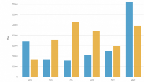 2020年9月,中国宣布到2060年实现碳中和,这是中国此前承诺到2030年达到碳排放峰值的重要后续行动。一年后,这个世界第二大经济体也承诺停止在海外建设煤炭项目,但具体细节尚不清楚。中国国内取得了令人放心的进展:2020年风电装机容量达到了历史最高水平72.4GW,比2019年增长了近三倍。与此同时,太阳能光伏以49.3GW紧随其后,比19年增长了60%以上。