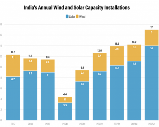 印度激进的可再生能源目标——从目前到2030年增加到500GW——有利于部署,还有稳定的政府政策,如优先调度,无论价格如何,市场优先考虑清洁能源计划而不是化石燃料计划,并免除输电费用,这让他们在财务上比传统能源更有优势。这些努力得到了回报——自2017年以来,清洁能源在新增产能方面不断超过煤炭。该国现在不仅要实现到2022年175GW的可再生能源产能目标,还要实现到2030年安装50%非化石能源产能的目标。