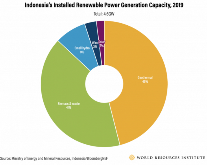 但印尼还有一个优势,那就是地处环太平洋火山带之上,这是一个构造和火山活动密集的地区。这使得这个岛国拥有世界上最大的地热潜力,其地热资源占已安装可再生能源的近一半(46%)。生物质能以41%位于第二,而太阳能和风能的总和远远落后,只占总量的5%。