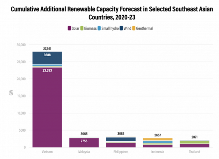 2020-23年东南亚部分国家累计新增可再生能源产能预测。来源:BloombergNEF