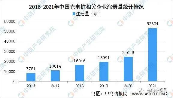 资本看好充电桩领域,这几年与充电桩相关的企业数量呈现出了飞速增长的趋势。2016年我国充电桩相关企业注册量仅7781家,2017年突破1万家,2020年突破2万家达到24049家。2021年科技企业跨界造车,带动充电桩相关企业增加。2021年充电桩相关企业注册量突破5万家达到52634家。