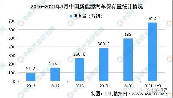 2016年中国新能源汽车保有量不足100万辆。截至2021年9月,全国新能源汽车保有量达678万辆,占汽车总量的2.28%。其中纯电动汽车保有量552万辆,占新能源汽车总量的81.53%。