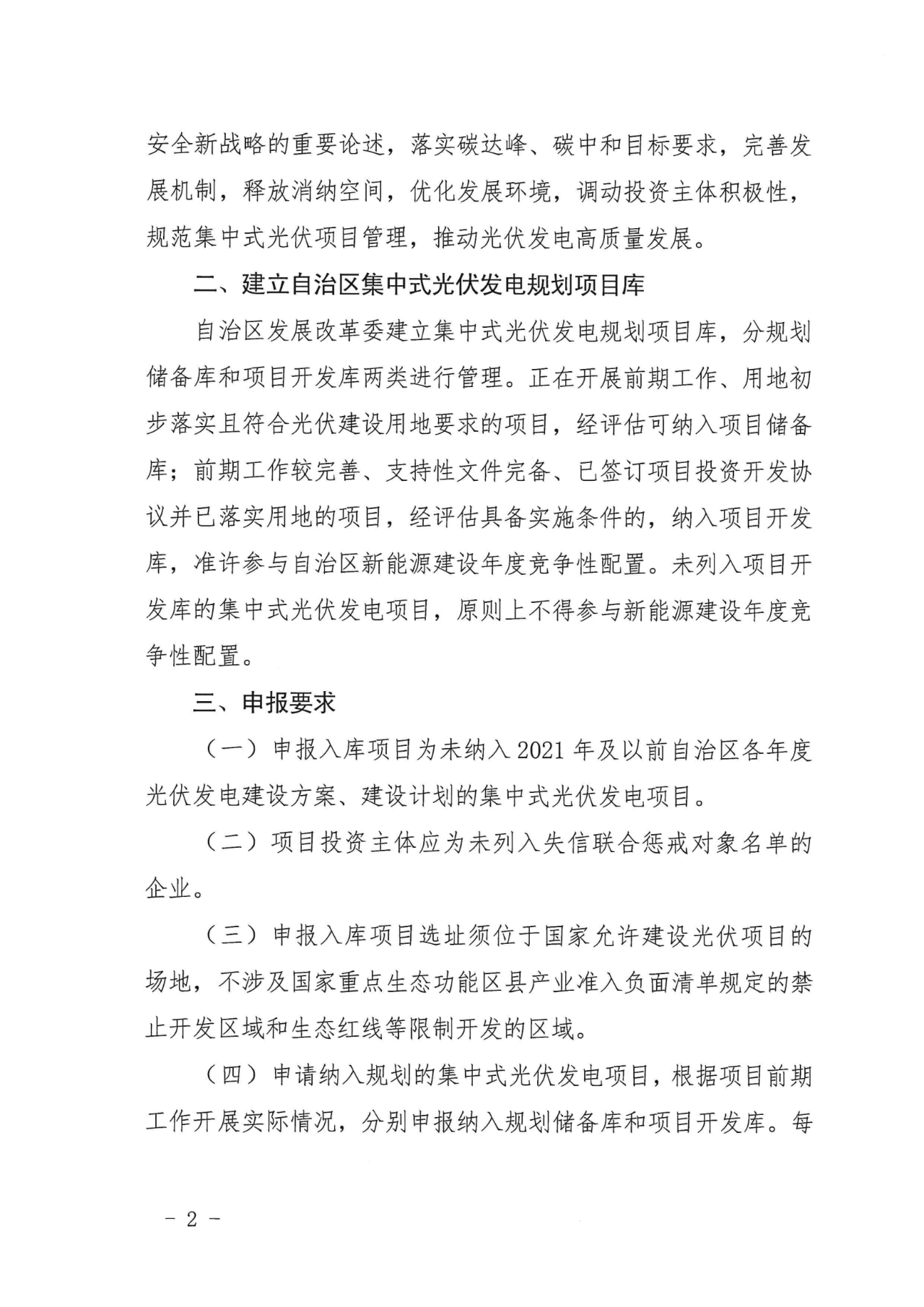 在具体申报要求方面,主要为未纳入2021年及以前自治区各年度光伏发电建设方案、建设计划的集中式光伏发电项目。项目建设地不涉及禁止开发区域和生态红线等限制开发的区域。