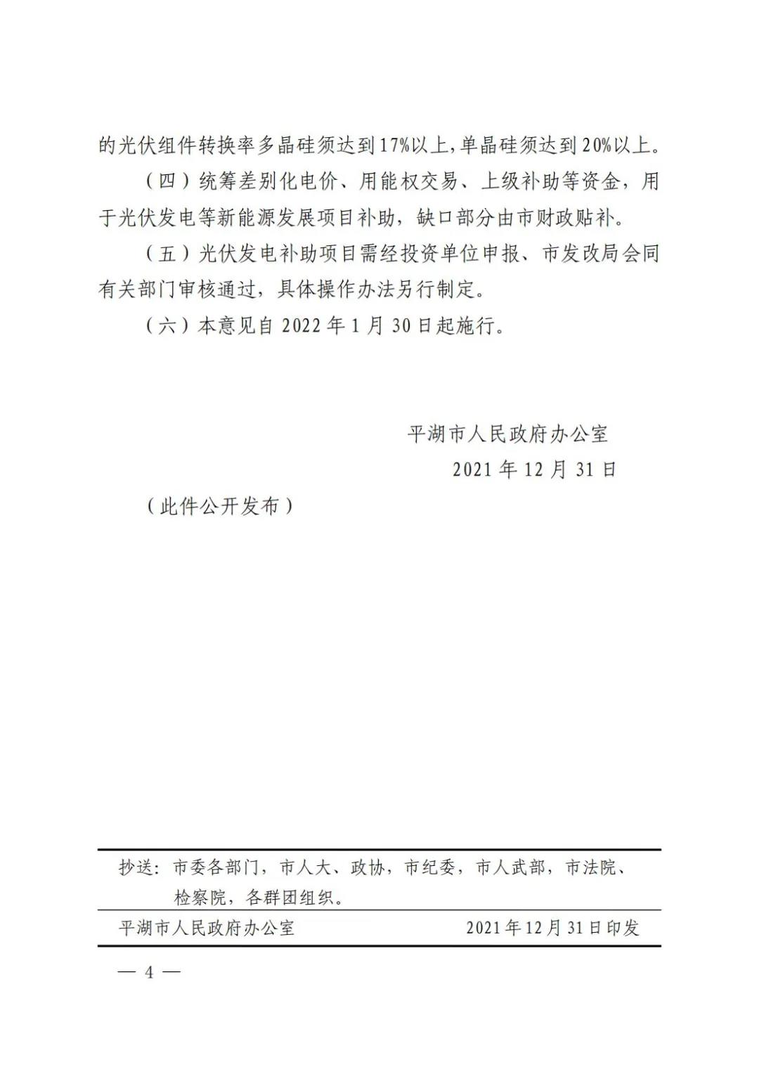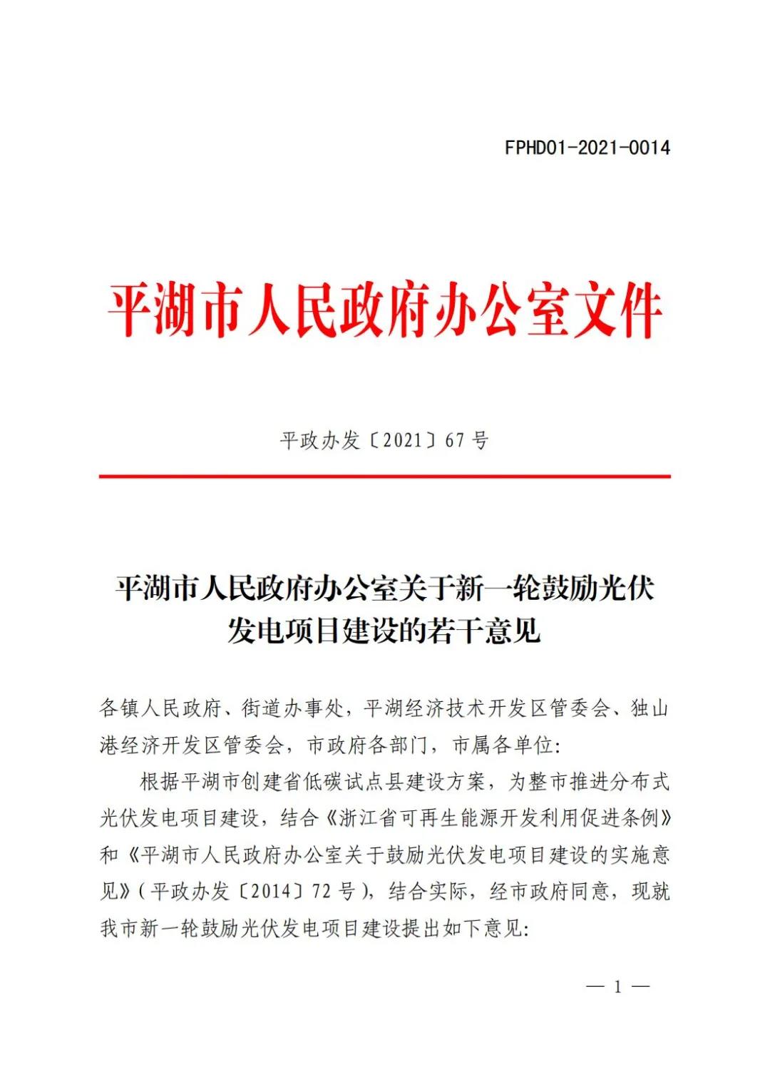 1月11日,平湖市人民政府发布了关于新一轮鼓励光伏发电项目建设的若干意见。明确到“十四五”末,平湖市光伏发电装机容量达到600兆瓦以上,实际新增200兆瓦以上,年平均新增装机容量在40兆瓦以上。