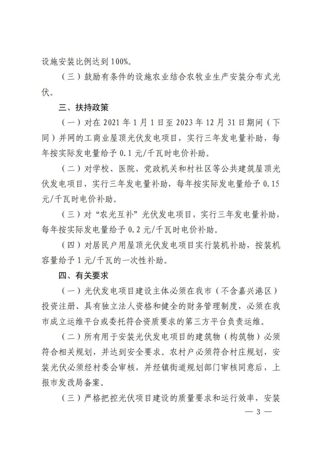 扶持政策方面,对在2021年1月1日至2023年12月31日期间(下同)并网的工商业屋顶光伏发电项目,实行三年发电量补助,每年按实际发电量给予0.1元/千瓦时电价补助。