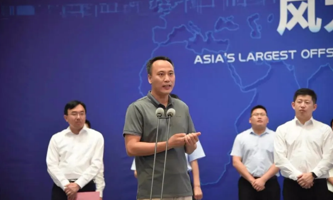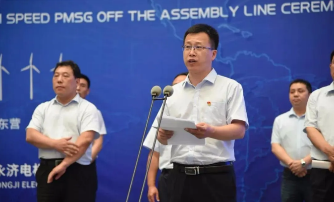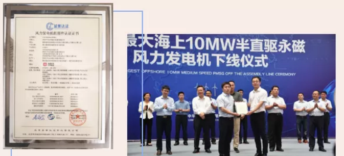 随着山东省东营市委副书记、市长赵志远、中国可再生能源学会风能专业委员会秘书长、北京鉴衡认证中心主任秦海岩、东营市副市长冯艺东、明阳智慧能源集团股份公司执行总裁张启应、东营市政府秘书长郭新民、中车产业发展事业部经营技术处副处长马腾、河口区委副书记、区长田兵兵及中车永济电机公司总经理肖安华缓缓掀开红绸,亚洲最大海上10MW半直驱永磁风力发电机成功下线!