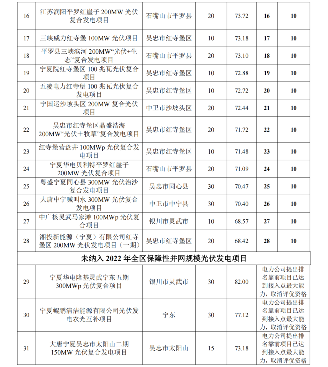 3月6日,宁夏自治区发改委下发关于宁夏回族自治区2022年光伏发电项目竞争性配置评优结果的公告,按照《自治区发展改革委关于2022年光伏发电项目申报有关事项的通知》(宁发改能源(发展)〔2022〕50号),经过对项目用地及电网接入核查、专家评分、接入点超规模、合理核定项目容量等环节,共28个404万千瓦项目纳入2022年全区保障性并网规模。