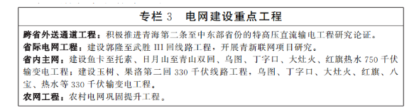 扩大电力跨省外送通道。在实现青海省内清洁低碳发展的基础上,推进跨省电力外送通道布局和建设,积极扩大绿色电力跨省跨区外送规模,支撑清洁能源产业高地建设,服务全国碳达峰目标实现。建成投产青海至河南±800千伏特高压直流工程二期配套电源,实现满负荷送电。立足“打造国家清洁能源产业高地”战略定位,重点围绕海西清洁能源基地开发,推进第二条特高压直流外送通道研究论证工作。另外,加强省际电网互联互通、加快构建省内坚强骨干电网、打造清洁低碳的新型配电系统、探索零碳电力系统建设等。